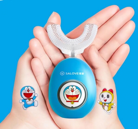 它的使用方法也很简单,智能计时设计,分四个区域定时刷牙,每30秒会有提示提醒换区,到时间自动停止。保障口腔均匀洁净的同时,更可培养孩子刷牙好习惯。24000次/min 高频震动,刷牙更干净。此外,它的刷头采用了精选美国杜邦超细软毛,弹性大,柔软度高,全方位呵护宝宝稚嫩牙龈。值得一提的是,它还分为早安/晚安双模式,早上可清洁夜晚产生的牙菌斑,睡前可舒缓牙龈。 SALOVE深爱 SA-1-C4 推荐理由:SALOVE深爱 携手经典卡通形象哆啦A梦,限量发售儿童 U 型智能牙刷。采用独特的 U 型设计,有蓝色/黄色双色可选。更贴合宝宝牙齿。轻轻一咬,360°有效包裹。