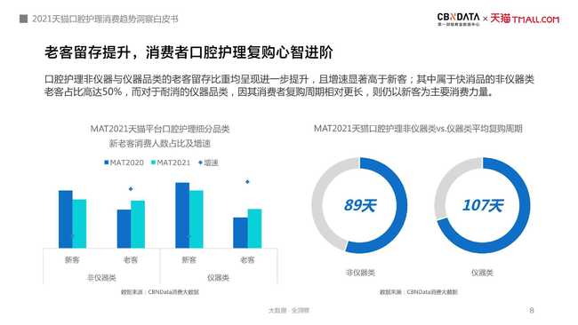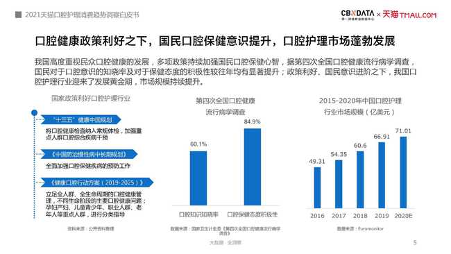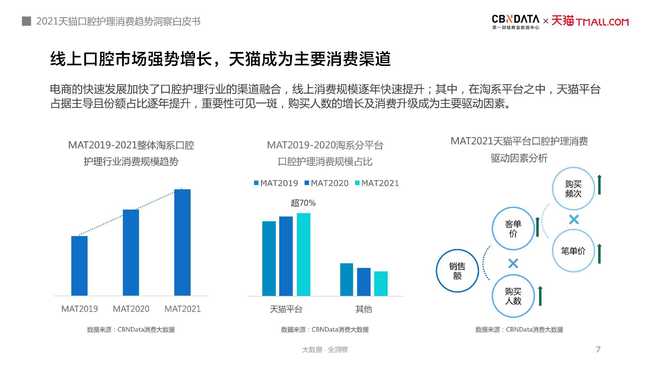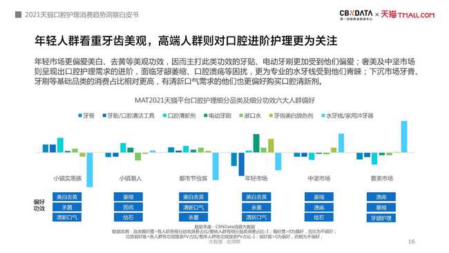 自2010年来,我国口腔患者人数逐年增加并已在2019年达到7亿人,占全国总人口的一半。丁香医生2021年的国民健康调研数据显示,口腔问题位列国民健康困扰Top5且较去年上升1位,我国的国民口腔健康已经成为了不可忽视的问题。 近年来,随着社会经济的发展与口腔健康教育的普及,消费者的口腔保健意识在逐渐觉醒。白皮书显示,2020年我国口腔护理行业市场规模达到71.01亿美元,而且体现出巨大增长潜力,2020年增速达到了13%。根据公开数据预测,未来15年内涵盖口腔护理、预防及治疗的中国口腔大健康市场有望超过5000亿元。 口腔护理市场的蓬勃发展,主要源于越来越多增量人群的不断加入。白皮书显示:女性消费者是口腔护理的核心消费人群,消费占比超7成;95后Z世代的消费占比进一步提升,成为驱动口腔护理大盘增长的增量人群。 中坚、奢美市场消费规模领先,占比分别超30%及40%,是口腔护理市场的核心消费力量;年轻市场消费快速增长超40%,驱动了整体市场的进一步发展。 细分人群中,小镇潮人更愿意在口腔护理市场“氪金”,客单价增速突出,而年轻市场则更偏好频繁购买,购买频次显著提升。 互联网+时代下,电商的快速发展,加速了口腔护理行业的渠道融合,助力行业快速发展。白皮书的大数据显示,线上口腔市场强势增长,天猫成为主要消费渠道。其中,在淘系平台之中,天猫平台占据主导且份额占比逐年提升,购买人数的增长及消费升级成为主要驱动因素,天猫平台2021年口腔护理消费规模超过70%。