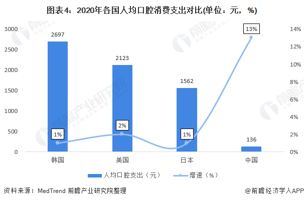 对比2020年各国人均口腔消费支出对比来看,相比于发达国家,2020年我国在口腔护理方面的人均消费支出仅为136元每人,较发达国家仍有巨大的差距;但是相比之下,我国人均口腔消费支出的增速达13%,处于快速增长水平,我国口腔护理行业具有巨大的消费潜力。