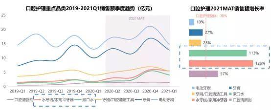 口腔护理能带动多大市场 2020年天猫商城口腔护理整体销售达63亿,京东整体销售近30亿,口腔护理一跃成为继皮肤护理和头发护理之后的日化品类的第三大分支,口腔护理市场规模接近500亿元。2021年上半年牙膏搜索量排名第一,搜索增长率超过90%,其次是牙刷。和去年的市场成交额相比,牙刷、电动牙刷、牙膏增长略有放缓,漱口水、冲牙器出现了较为迅猛的上升。据统计,2021上半年口腔护理领域起码已经有20家公司获得融资,总融资金额超过50亿,涌现了参半、BOP、冰泉、牙博士、清汁科研等大批新兴口腔护理品牌,一举成为上半年最吸金的赛道之一。 口腔护理的四大基本需求是去牙垢、去黄、去口臭,解决牙龈出血,在此基础上牙膏和牙刷作为口腔护理的基础类目获得持续增长是符合预期的,另外因为相关产品功能功效已趋于完善也是虽有增长但增速放缓的一大因素。 值得注意的是牙膏中的高端产品上升明显,同时套装类产品由于出差、旅游等因素商品搜索量增长超过10倍。