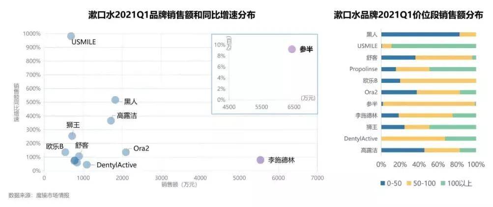 面对不同的需求,产品多样化尤为重要,国内新锐品牌其实很难快速覆盖用户的需求,绝大部分市场被国外品牌侵蚀,每个品类都有天花板存在,水牙线中有洁碧,电动牙刷有飞利浦,漱口水中有李施耐德,牙膏市场更是被联合利华和宝洁承包,国外品牌渗透率很高。 但国外品牌的价格昂贵,新锐国货品牌凭借价格优势和地理优势打开了国内市场。 阿里2021年上半年口腔护理品类数据显示,水牙线增幅达到了150%,天猫水牙线热销榜单中密浪冲牙器、米家电动冲牙器、拜尔专业冲牙器、素士专业冲牙器与洁碧无限台式冲牙器位居前五位,国产品牌实现了销量和增速“双高”,其中除了洁碧售价高达1098元,其他产品的售价均在400元以下。 除了水牙线,漱口水的增幅也达到了165%,其中usmile同比增长982%,黑人同比增长517%,天猫漱口水回购榜中参半益生菌漱口水,黑人漱口水,爱兰歌娜漱口水,李施德林零度漱口水,舒客专效清新漱口水榜上有名,黑人和舒客漱口水有其品牌为其背书,更容易被大众买账,新锐国产品牌的目标性更强,相比李施德林的辛辣,口感和观感更容易被接受。