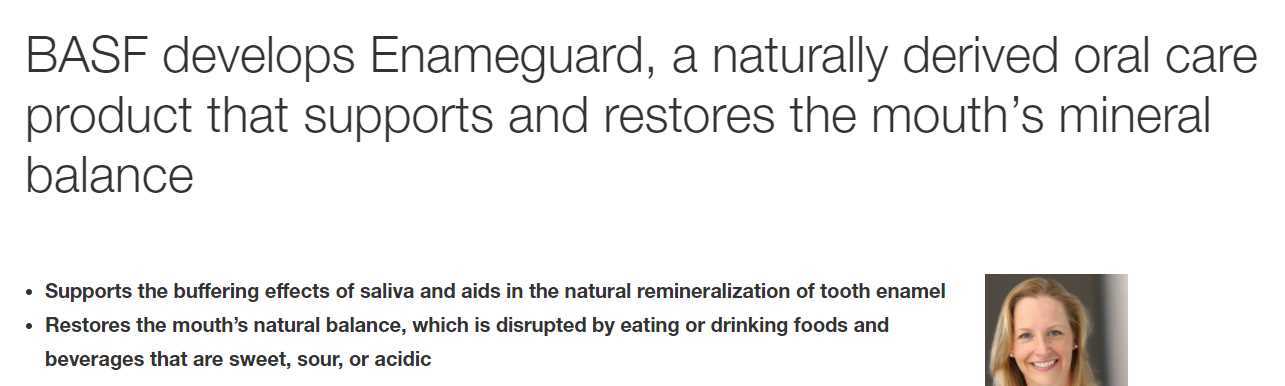 巴斯夫称,当口腔的自然平衡被打破时,含有Enameguard的口腔护理产品可以帮助恢复自然平衡。它与牙釉质表面结合,并与唾液中发现的周围钙离子和磷酸根离子相互作用。市场上的其他类似技术对水敏感,但Enameguard是高度水溶性的。