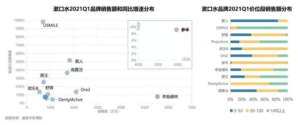 阿里2021年上半年口腔护理品类数据显示,水牙线增幅达到了150%,天猫水牙线热销榜单中密浪冲牙器、米家电动冲牙器、拜尔专业冲牙器、素士专业冲牙器与洁碧无限台式冲牙器位居前五位,国产品牌实现了销量和增速“双高”,其中除了洁碧售价高达1098元,其他产品的售价均在400元以下。除了水牙线,漱口水的增幅也达到了165%,其中usmile同比增长982%,黑人(好来)同比增长517%,天猫漱口水回购榜中参半益生菌漱口水,黑人漱口水,爱兰歌娜漱口水,李施德林零度漱口水,舒客专效清新漱口水榜上有名,黑人和舒客漱口水有其品牌为其背书,更容易被大众买账,新锐国产品牌的目标性更强,相比李施德林的辛辣,口感和观感更容易被接受。