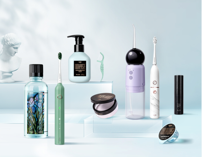 03 Usmile:以电动牙刷破局,站稳口腔护理主场 Usmile 是广州星际悦动股份有限公司旗下全面口腔护理品牌,倡导像护肤一样护理口腔。2016年至今共荣获了16项国内外设计大奖,2020年“双十一”期间,入选 2020 年度天猫十大新品牌,销售额超1亿,成为国内首个破亿的电动牙刷品牌,在口腔护理新锐品牌销售榜单中位居第一。2021年中消协发起的测评中,Usmile 电动牙刷综合实力位列第一,测试维度包括清洁效果、噪声评价、充电放电时间等。 Usmile 覆盖口腔护理全产品线。Usmile 在品牌创立初期就定位全面口腔护理领域,布局全面口腔护理产品。早期的Usmile聚焦在电动牙刷单品的迭代和创新,高性价比、超长续航和高颜值是它的主要卖点,品牌以电动牙刷明星单品切入,锁定用户和渠道,快速占领市场,再逐步拓展到其他的产品类别。Usmile 天猫旗舰店产品分类显示,除了主打产品声波电动牙刷和冲牙器,还有牙线、牙膏、牙粉、漱口水、牙贴、口喷等口腔护理周边产品。从产品价格来看,Usmile电动牙刷价格从299元-2099 元不等,大多数产品价格在500元以下,产品以中端机型为主,含盖少数高端机型。
