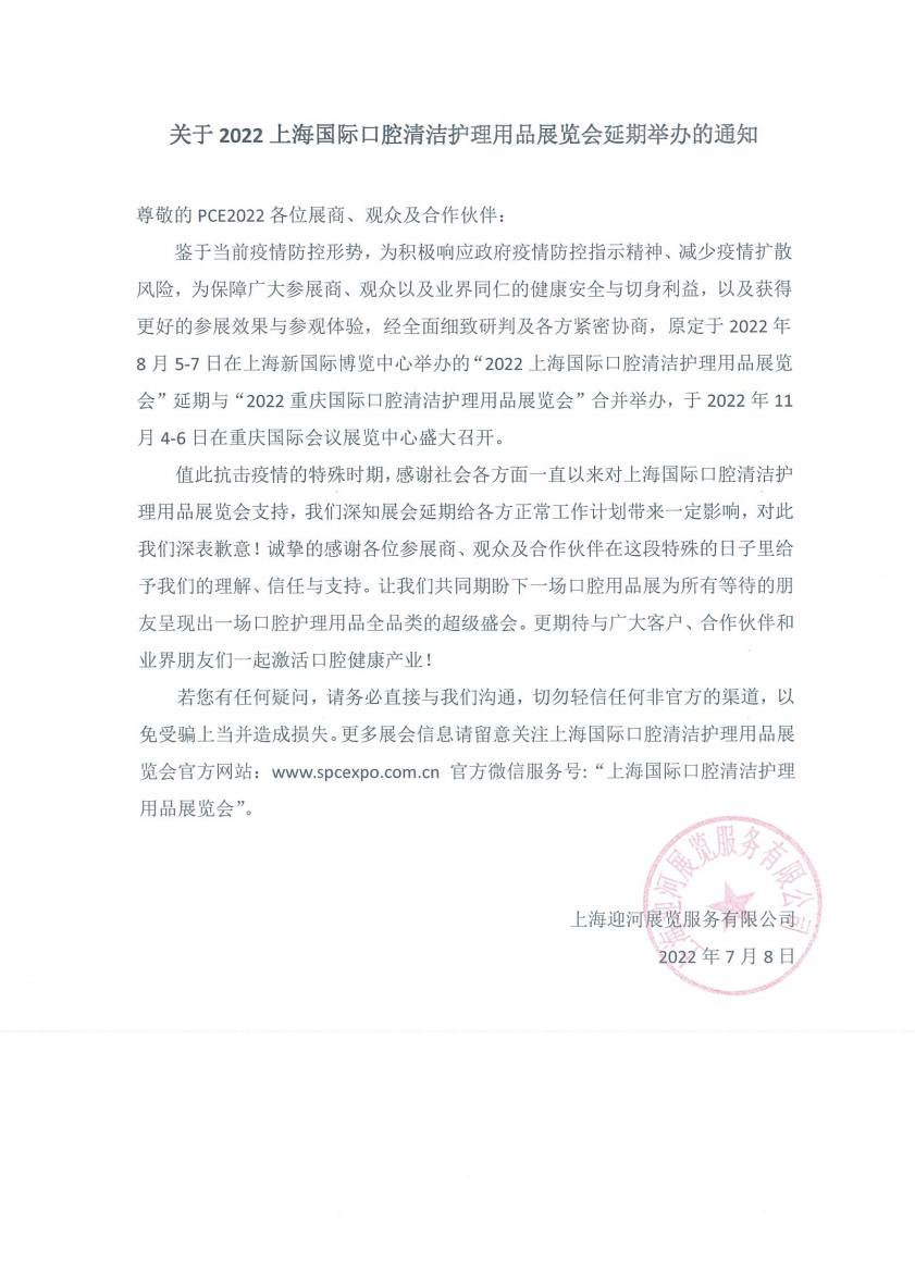 尊敬的PCE2022各位展商、观众及合作伙伴: 鉴于当前疫情防控形势,为积极响应政府疫情防控指示精神、减少疫情扩散风险,为保障广大参展商、观众以及业界同仁的健康安全与切身利益,以及获得更好的参展效果与参观体验,经全面细致研判及各方紧密协商,原定于2022年8月5-7日在上海新国际博览中心举办的“2022上海国际口腔清洁护理用品展览会”延期与“2022重庆国际口腔清洁护理用品展览会”合并举办,于2022年11月4-6日在重庆国际会议展览中心盛大召开。值此抗击疫情的特殊时期,感谢社会各方面一直以来对上海国际口腔清洁护理用品展览会支持,我们深知展会延期给各方正常工作计划带来一定影响,对此我们深表歉意!诚挚的感谢各位参展商、观众及合作伙伴在这段特殊的日子里给予我们的理解、信任与支持。让我们共同期盼下一场口腔用品展为所有等待的朋友呈现出一场口腔护理用品全品类的超级盛会。更期待与广大客户、合作伙伴和业界朋友们一起激活口腔健康产业!若您有任何疑问,请务必直接与我们沟通,切勿轻信任何非官方的渠道,以免受骗上当并造成损失。更多展会信息请留意关注上海国际口腔清洁护理用品展览会官方网站:www.spcexpo.com.cn 官方微信服务号:“上海国际口腔清洁护理用品展览会”。