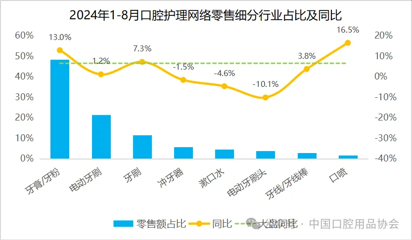 2024年1-8月口腔护理行业网络零售走势: 数据说明:本报告中数据包含天猫、京东、抖音、快手、淘鲜达、苏宁、丝芙兰、考拉、聚美、日上等主要电商平台。